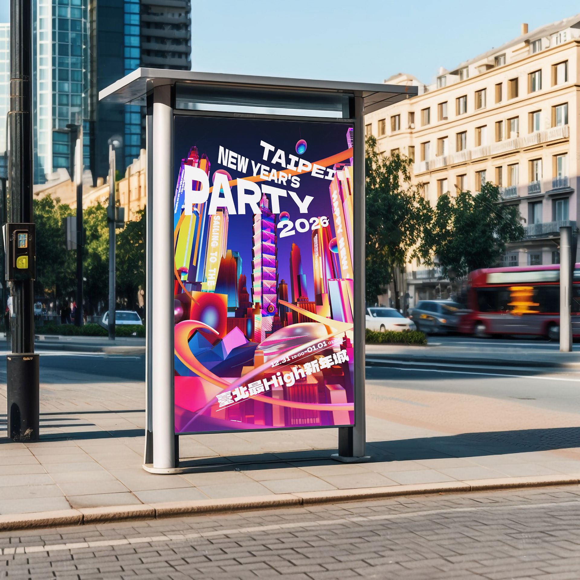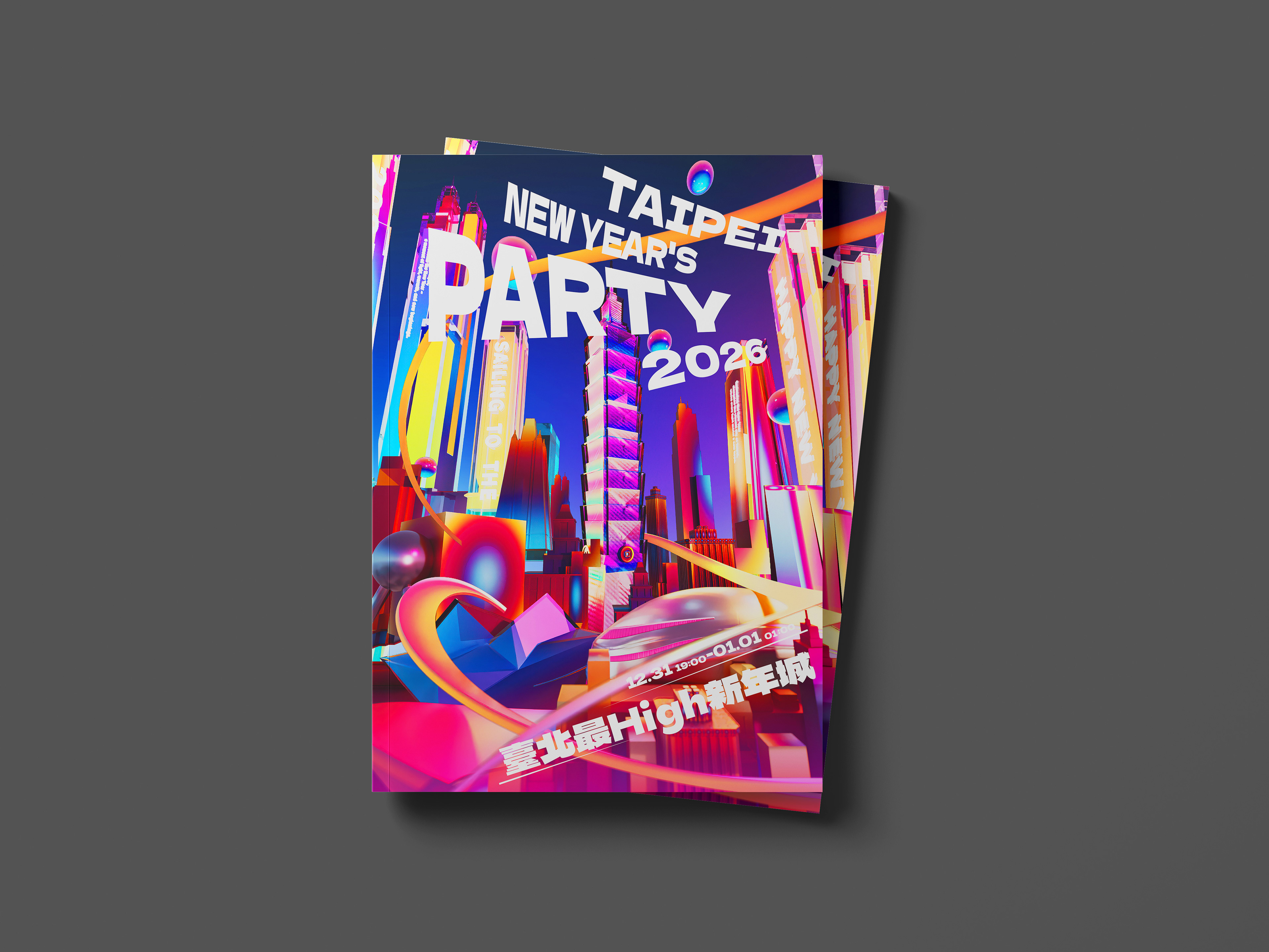 整體視覺大量運用螢光色系與高對比光影效果,結合數位光束、霓虹線條與科技紋理,營造出強烈的未來氛圍與城市節奏。透過動態節奏與視覺層次的堆疊,呈現跨年倒數時刻的張力與爆發力,象徵城市邁向 2026 的嶄新能量與無限可能。