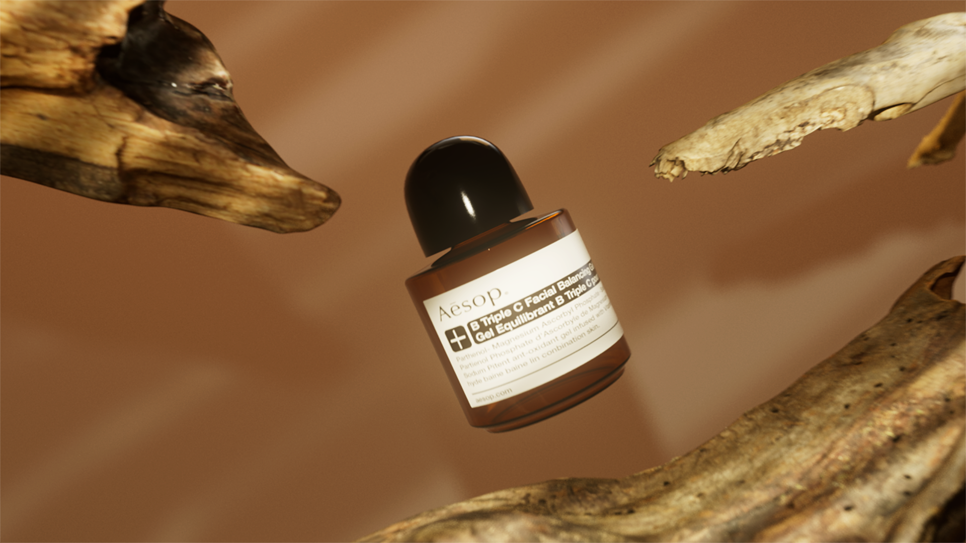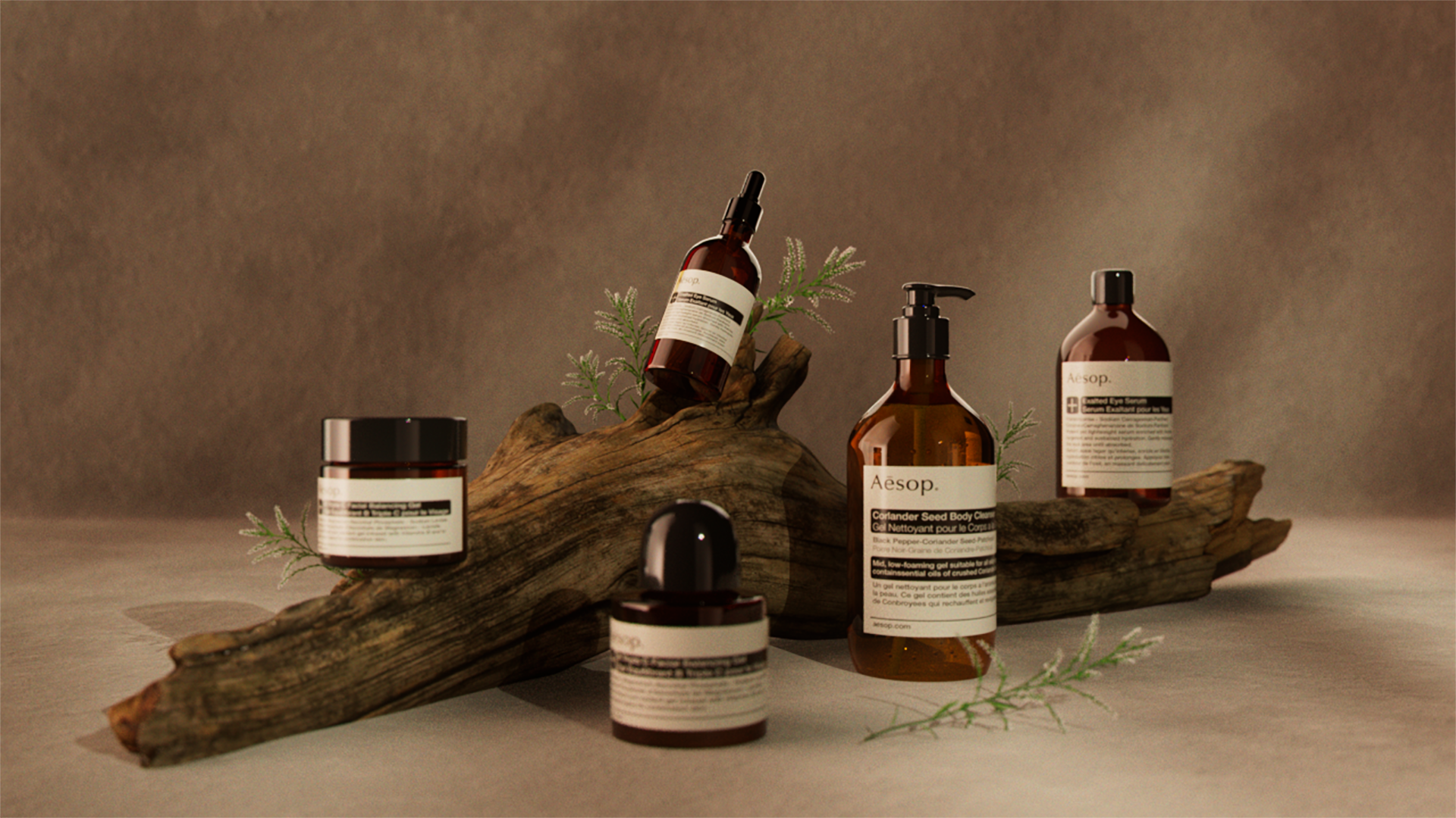 This composition evokes the brand’s understated elegance through warm, earthy tones, organic textures, and minimal composition. Each element, from the raw wood to the gentle lighting, mirrors Aesop’s devotion to natural ingredients and timeless sophistication.